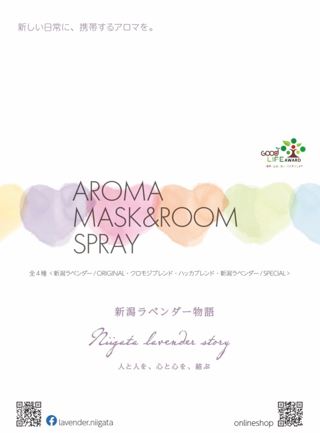 ①新潟ラベンダー・スペシャル:今日一日頑張った自分に、また大切な人への贈り物に、疲れを忘れさせる香りです。気持ちよく春のアレルギーシーズンを過ごしたい方に。ラベンダーの香りと爽やかなレモングラス、ティートゥリーの明るい香りがサポート。